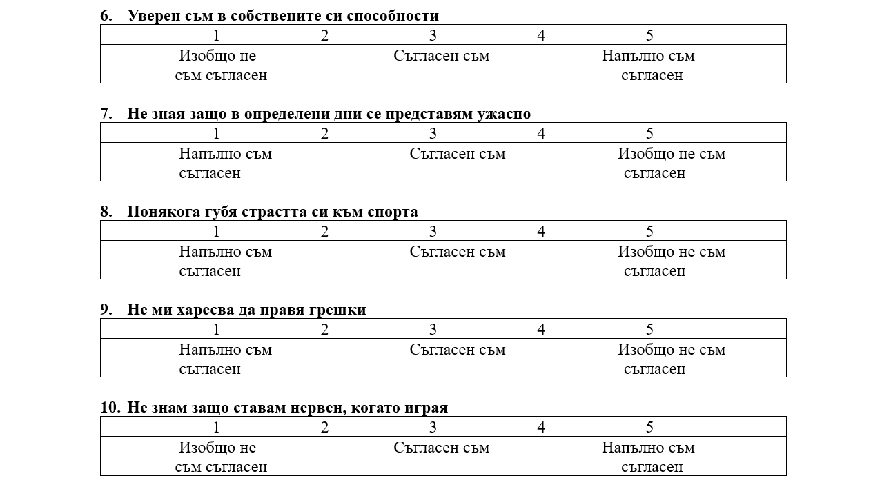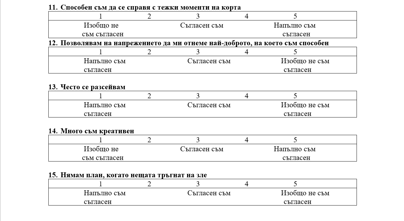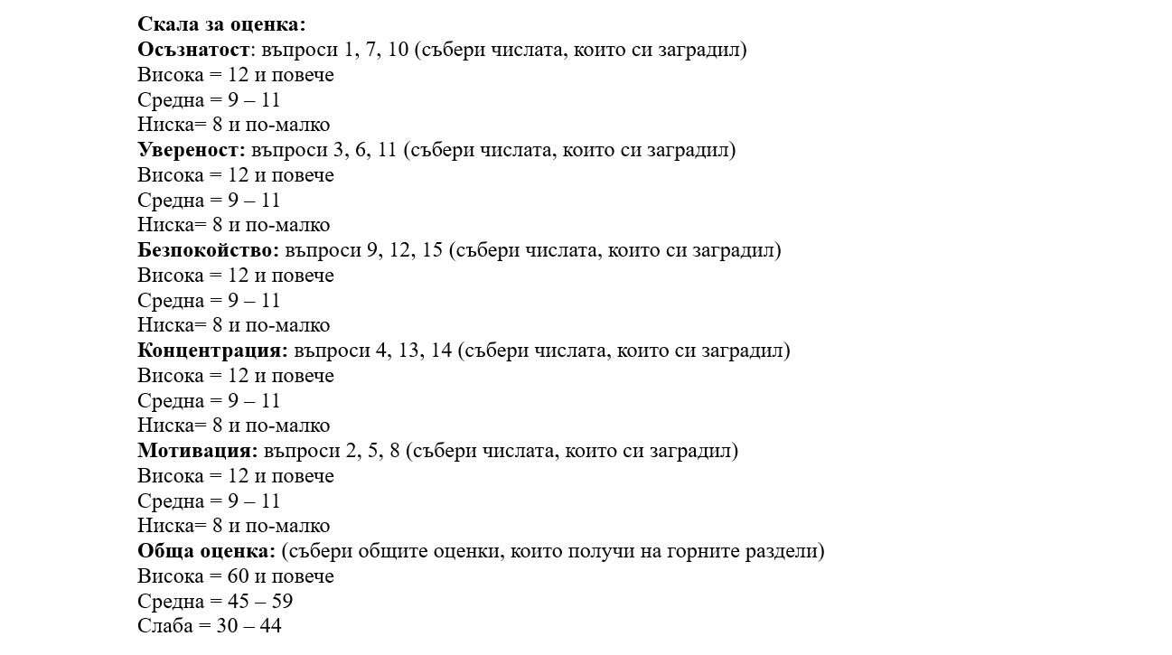 Прочети твърденията по-долу и запиши числото, което в най-голяма степен съответства на твоите усещания и преживявания. Няма правилни и грешни отговори. Бъди максимално откровен, за да получиш максимално прецизен резултат.